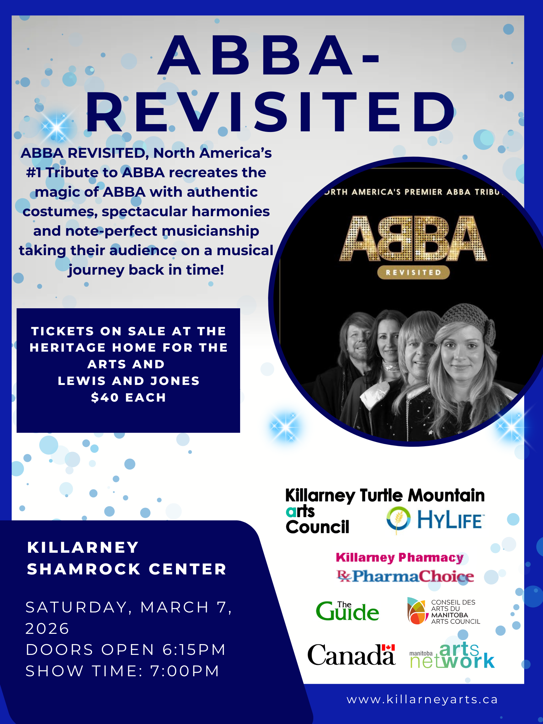 KTMAC, Hylife and Killarney Pharmacy are excited to bring North America's #1 tribute to ABBA to Killarney on Saturday, March 7! Tickets are only $40 and you will experience authentic costumes, spectacular harmonies and note-perfect musicianship! Doors open at 6:15 and show starts at 7:00pm!