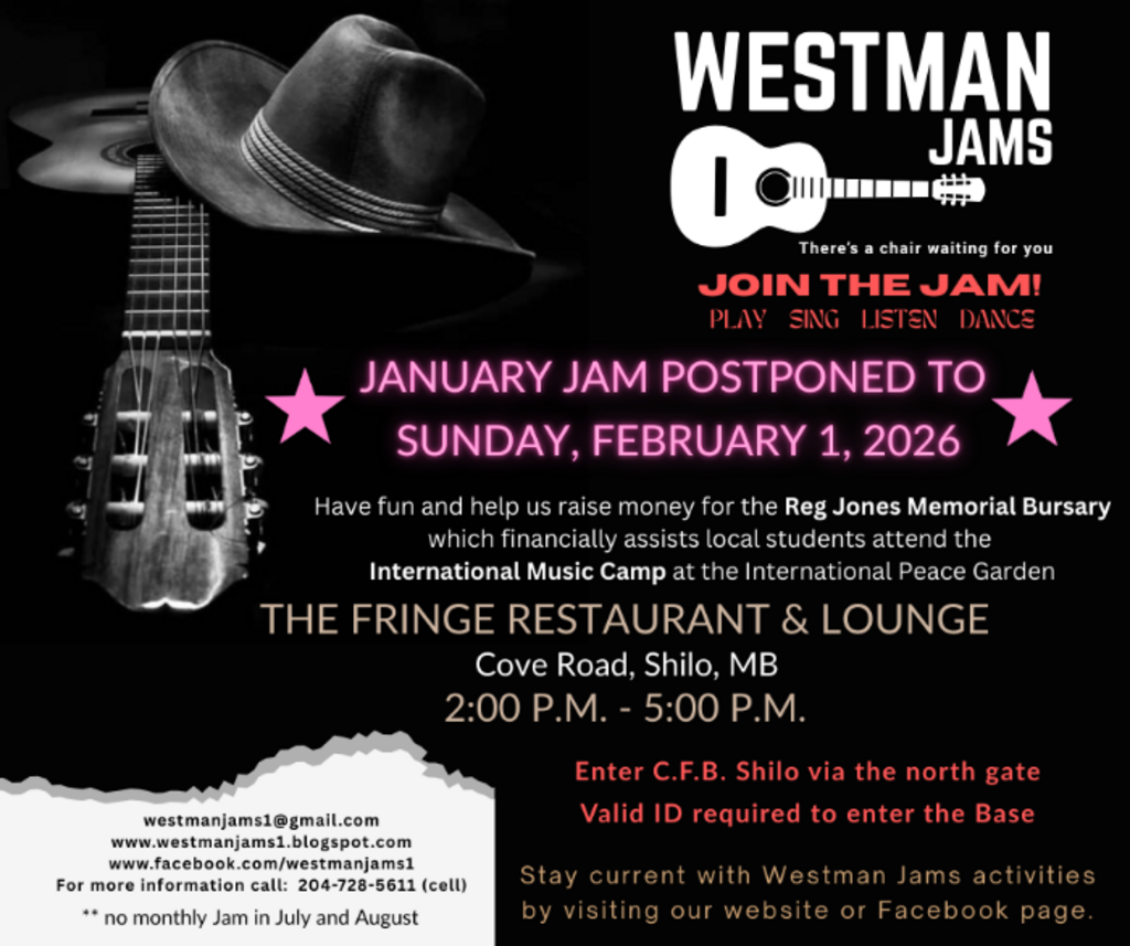 Due to extreme cold weather predicted for this weekend, the January Jam has been postponed to Sunday, February 1, 2026, at 2:00 p.m. at The Fringe Restaurant & Lounge in Shilo, MB. (Entrance to C.F.B. Shilo via the north gate accessible through the town of Sprucewoods. Valid ID required to access the Base.)