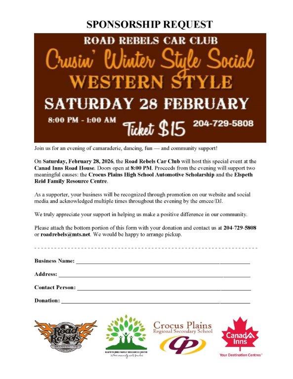 We are looking for prizes for our raffle table, so if you would like to support our fundraising for the Elspeth Reid Family Resource Centre and the Crocus Plains Automotive Tech Student Scholarship please call 204-729-5808 or email roadrebels@mts.net.