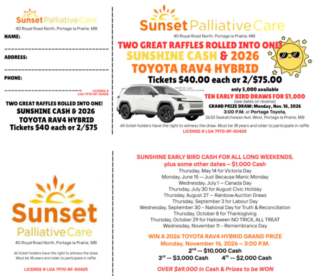 To purchase your raffle tickets please contact our office at 204-857-3746 or send an e-transfer to info@sunsetpalliativecare.org, please include mobile phone number in the message.