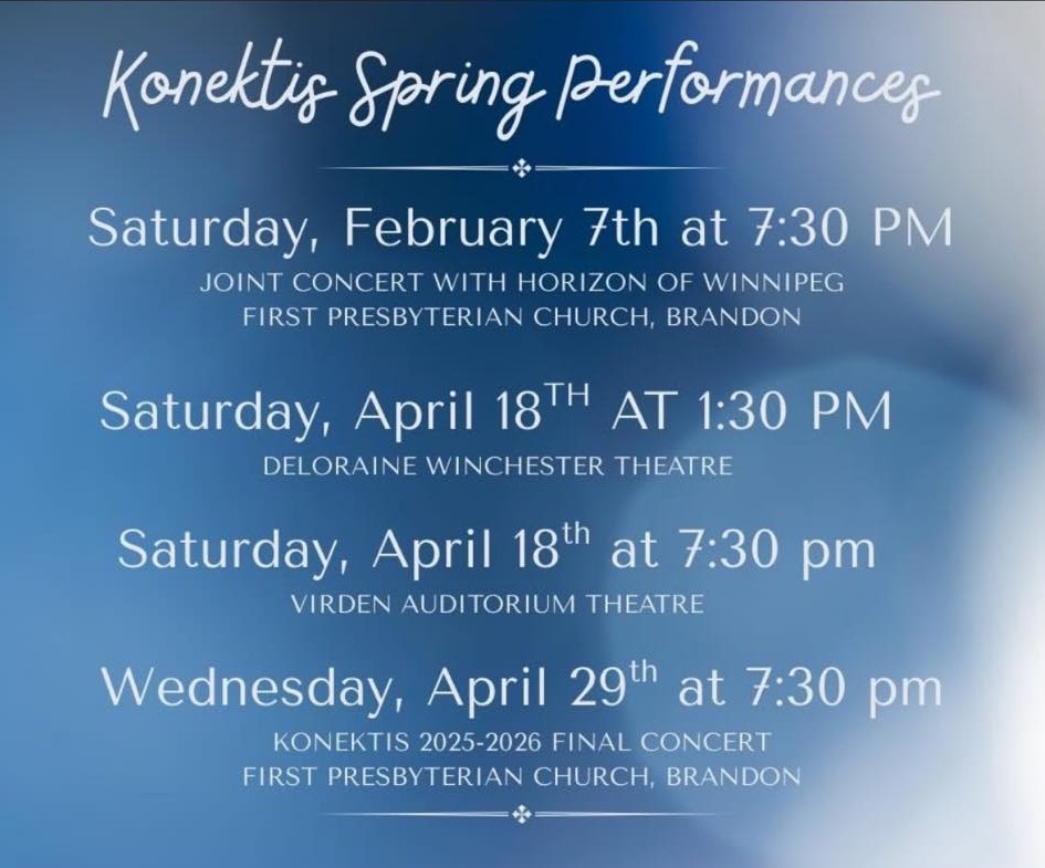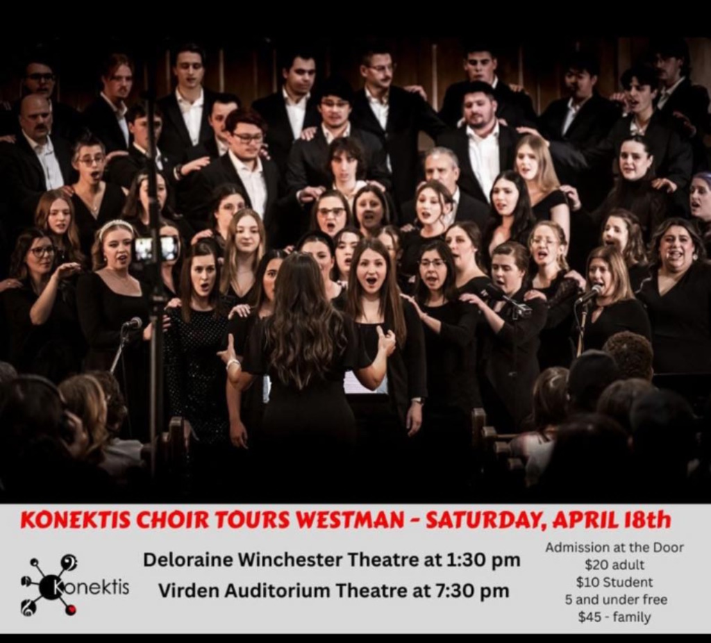 The Konektis Choir has 60+ singers that hail from Virden, Killarney, Cypress River, Glenboro, MacGregor, Carberry, Neepawa, Brandon, Rivers, and Brandon.