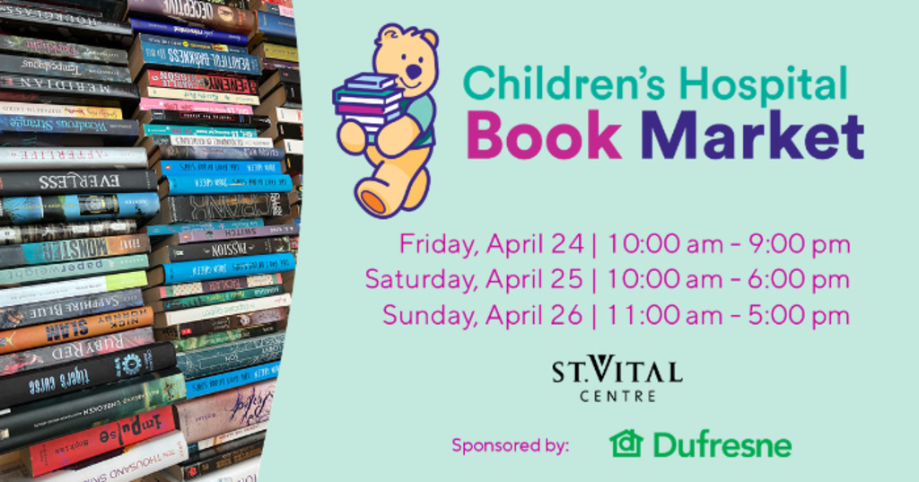 Visit St. Vital Centre from April 24 – 26 to shop for great books of all genres and support sick and injured kids in your community at the Children’s Hospital Book Market! All funds raised stay in Manitoba to help kids who need HSC Children’s Hospital.