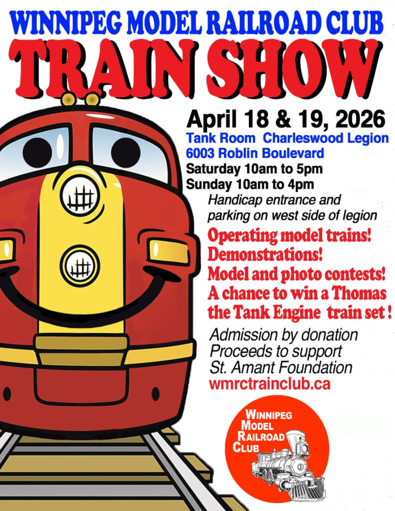 The Winnipeg Model Railroad Club is hosting its Annual Spring Show and Open House on Saturday and Sunday, April 18th and 19th. The Show is at the Charleswood Royal Canadian Legion, 6003 Roblin Boulevard, Winnipeg … the Legion with the tank. Doors open at 10:00 a.m. and the show is until 5:00 p.m. on Saturday and closes at 4:00 p.m. on Sunday. Parking and the primary entrance is on the east side of the Legion; handicap parking and accessibility is provided on the west side. Admission is FREE. Donations for our Club’s charity, the St. Amant Foundation and to aid with our operating expenses are graciously accepted. Always a crowd pleaser, there is a free-to-enter Door Prize … a complete Thomas the Engine operating set. There will be several operating model railroad layouts, plus many informative displays by others including the St. Amant Foundation, the Prairie Dog Central Railway, and the Midwestern Railway Association. Children of all ages can try the HO-scale switching puzzle and there will also be an operating layout of Thomas the Engine and his friends for everyone to run. Hot dogs, snacks, and refreshments are available.